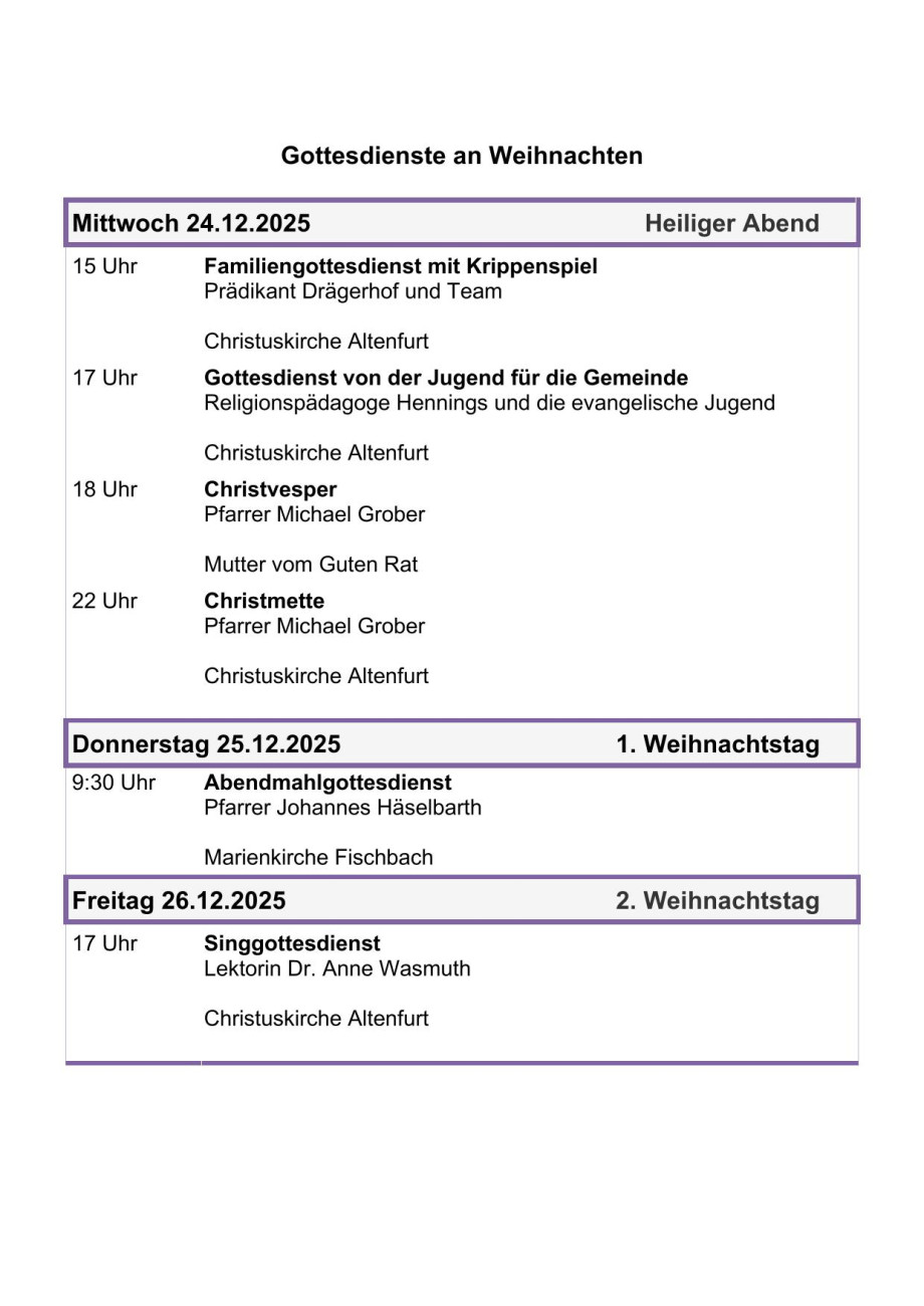 Am 1. Weihnachtstag findet kein Gottesdienst in Altenfurt / Moorenbrunn statt. Sie können jedoch den Abendmahlsgottesdienst in der Nachbarsgemeinde Fischbach besuchen.